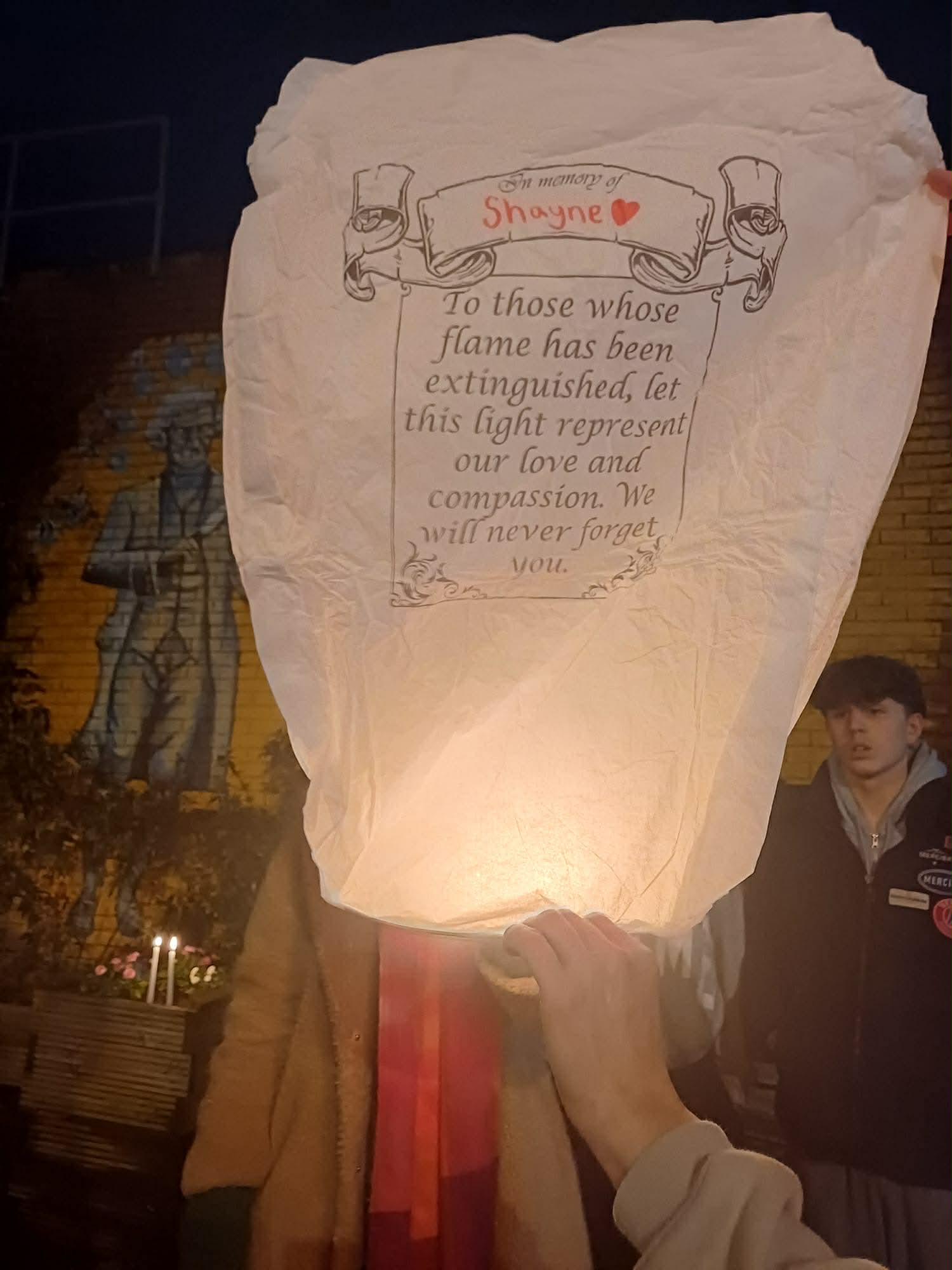 Organised by Lucy Holt, the evening saw candles and lanterns lit in Shayne’s memory, with flowers laid as those attending shared memories and stood together in support of those closest to him.