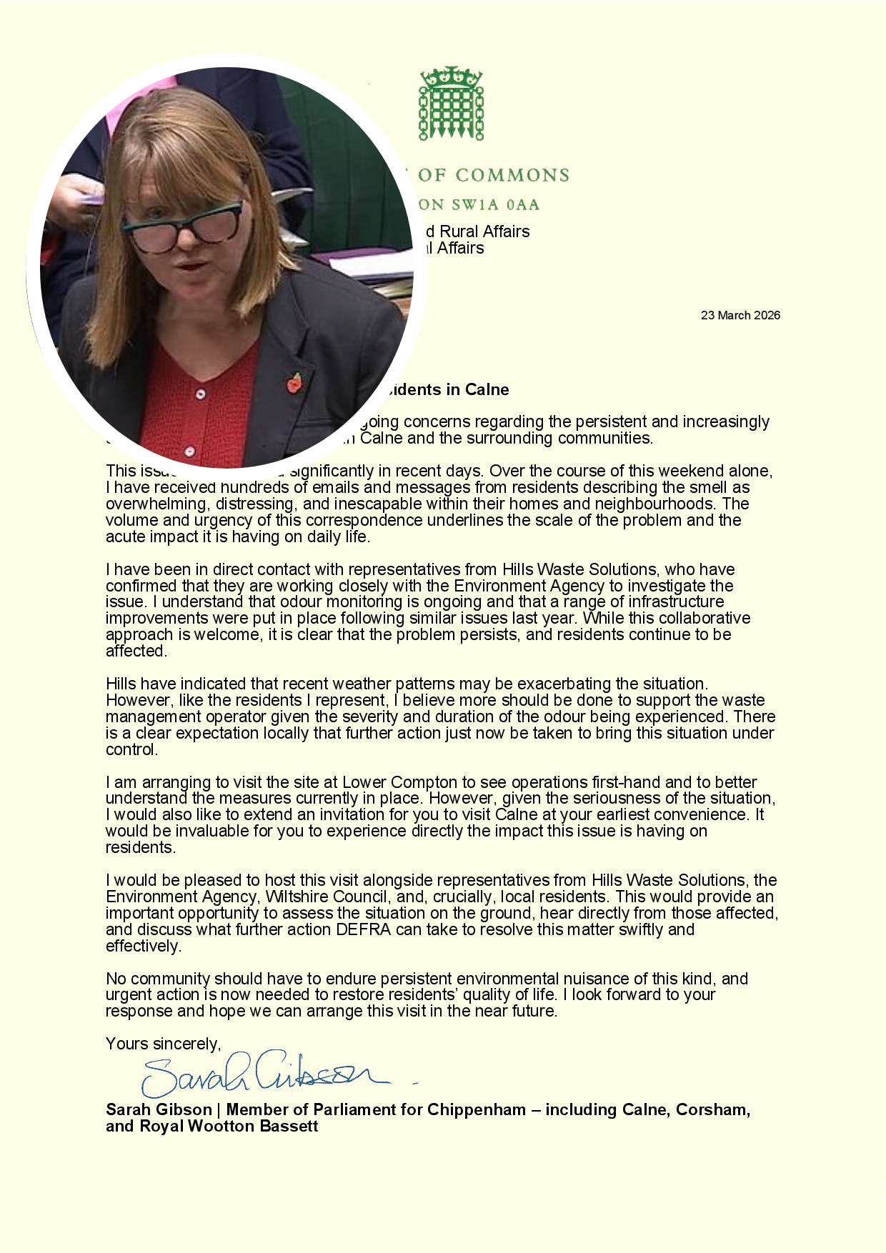 Wiltshire Liberal Democrat MP Sarah Gibson has stepped up her campaign to tackle the persistent odour from the Hills landfill site, after residents in Calne described the smell as “overwhelming”.