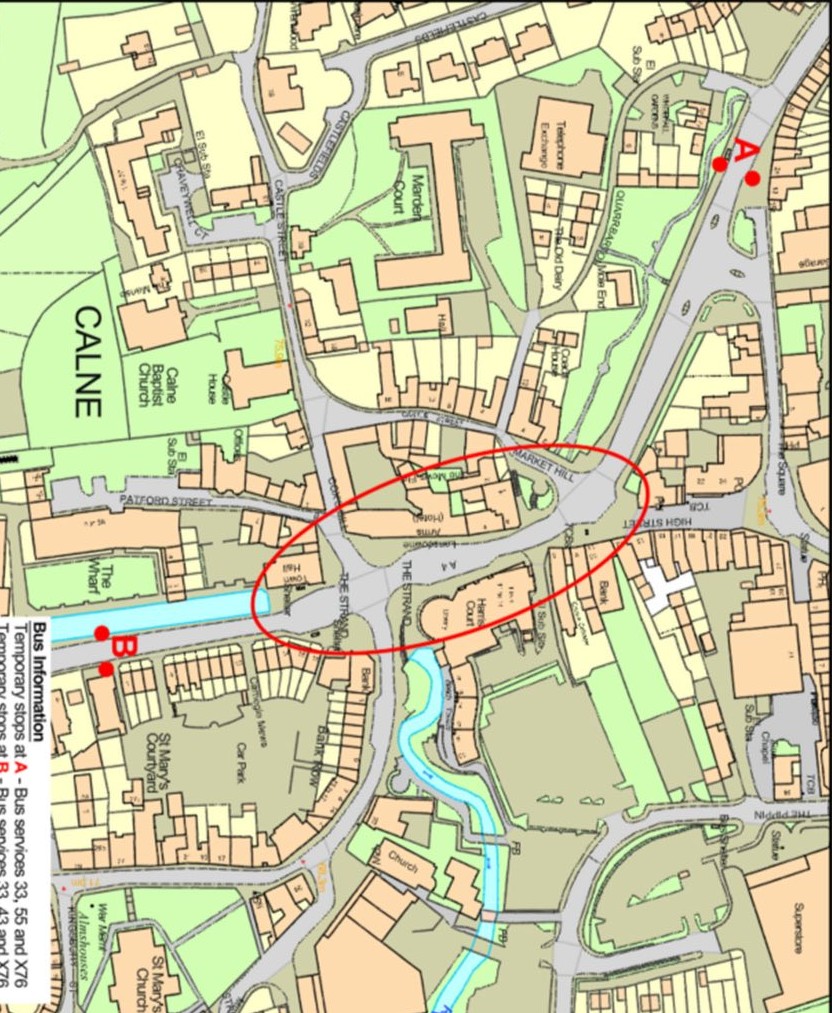Additional temporary bus stops will be provided near Calne Heritage Centre at the southern end of New Road for services 33, X76 and 43 to and from Marlborough.