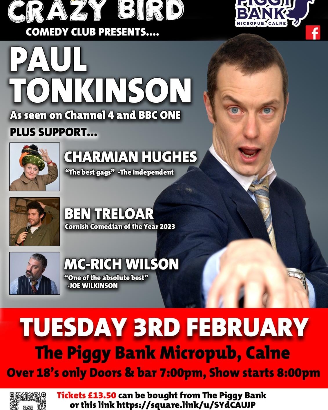 Tickets for Monday 3rd February can be bought from behind the bar at The Piggy Bank or online at https://square.link/u/SYdCAUJP.