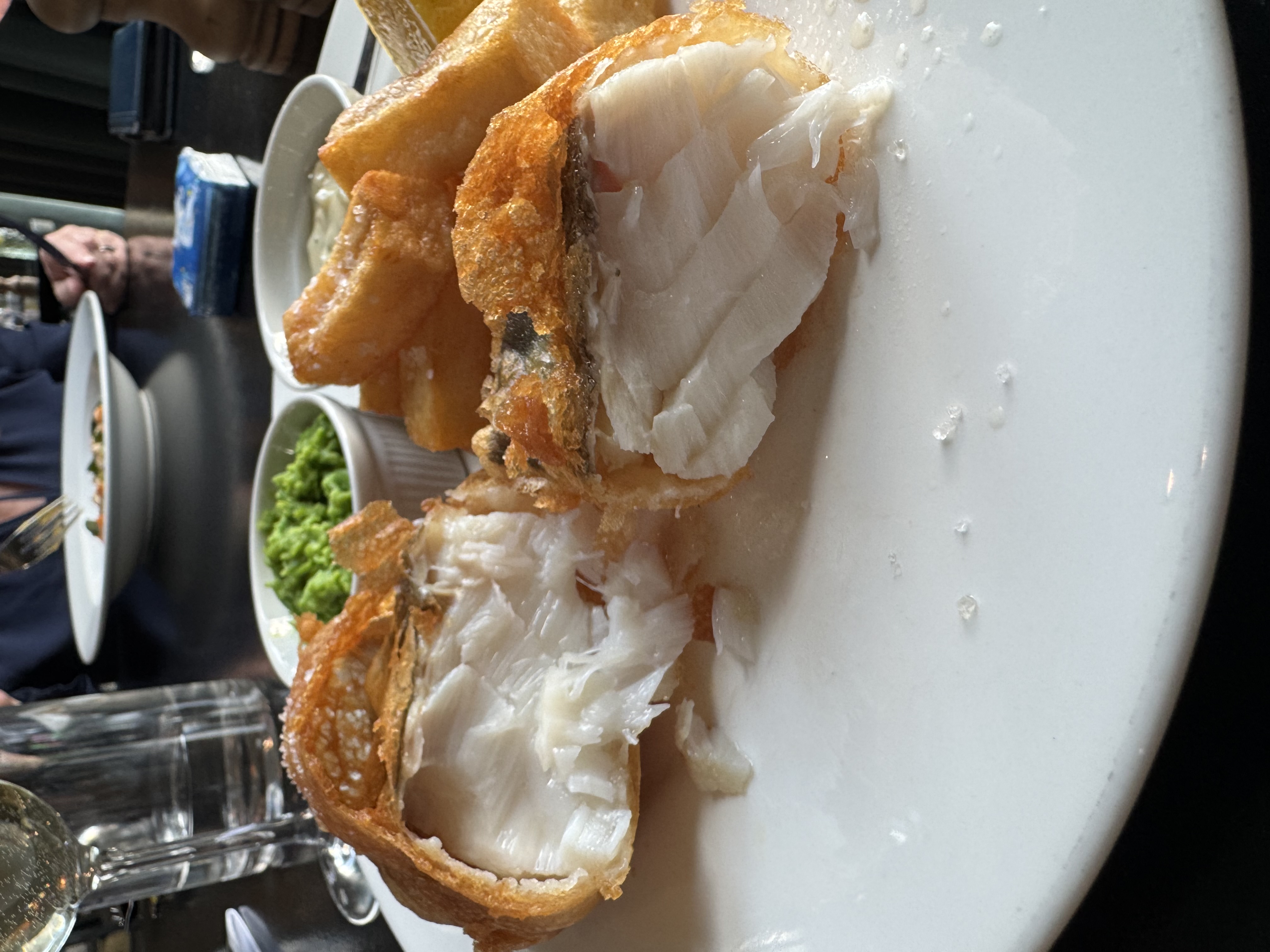For mains, the contrast between our choices highlighted the breadth of the menu. I selected the beer-battered fish and chips, a classic done exceptionally well. The fish itself was impressively generous: a thick, chunky fillet encased in light, crisp batter that remained delicate rather than heavy. It was, in my view, one of the most substantial pieces of battered fish I’ve been served, both visually impressive and full of flavour. The chunky chips were crunchy on the outside and fluffy within, while the mushy peas - often an afterthought elsewhere - were vibrant green and full of fresh flavour, clearly made with care. Even for those usually indifferent to mushy peas, these were a pleasant surprise. The tartare sauce complemented the dish without overpowering it. It was, quite simply, faultless.