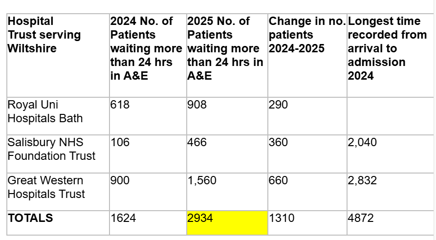 Data obtained through a Freedom of Information request submitted by the Liberal Democrats, shows that 2,934 patients waited more than 24 hours in A&E in 2025 across the three hospital trusts serving Wiltshire. That is an increase of 1,310 compared to 2024.